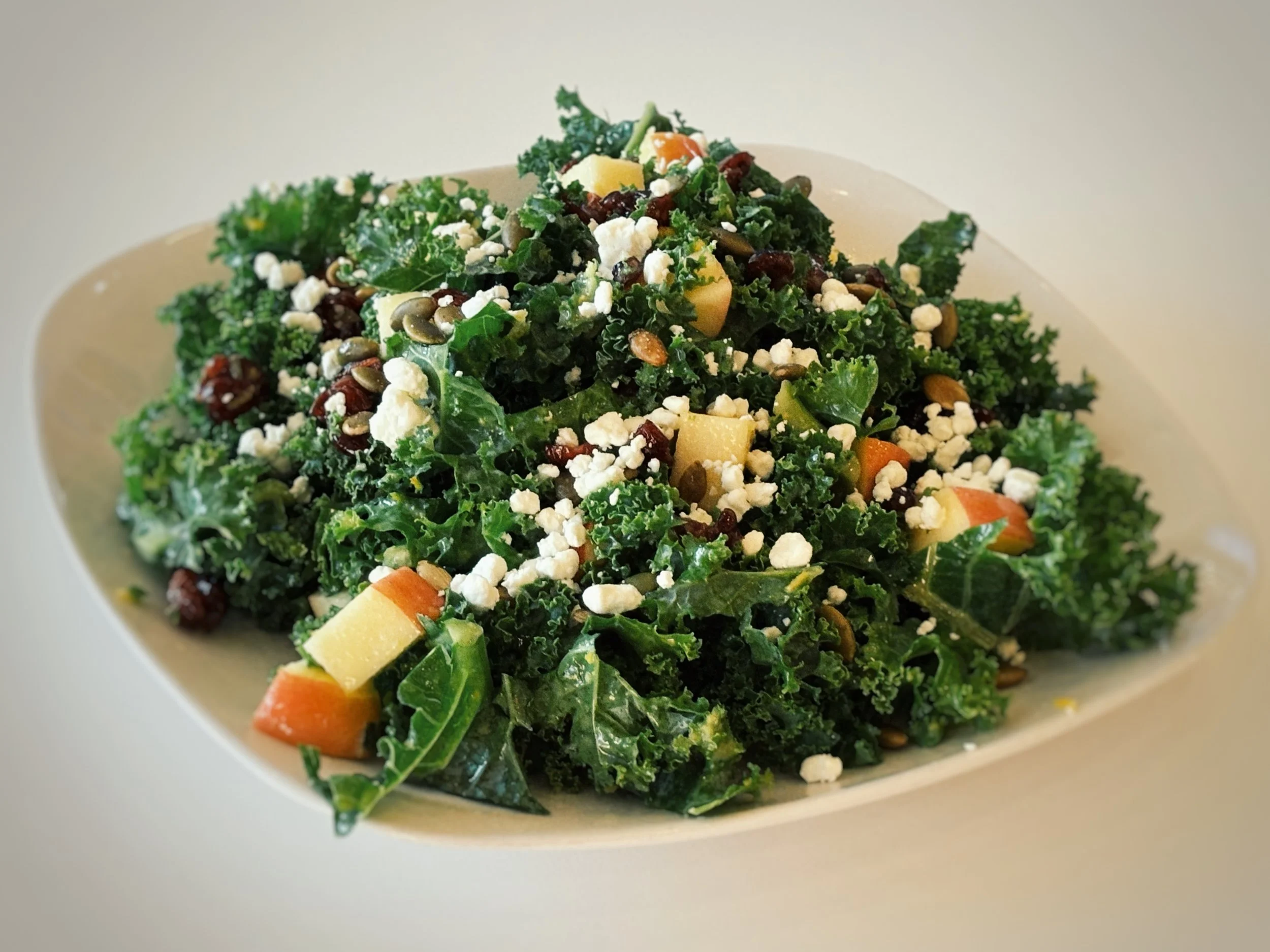 Fresh kale tossed with crisp local apples, dried cranberries, toasted pumpkin seeds, and creamy crumbled goat cheese, finished with our house-made citrus vinaigrette.